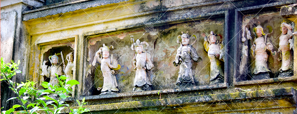 Phần tường hai đầu sân lọng đắp khuôn tranh, mái giả, đao cong, trong có phù điêu tượng kim cương đắp liền vào tường.